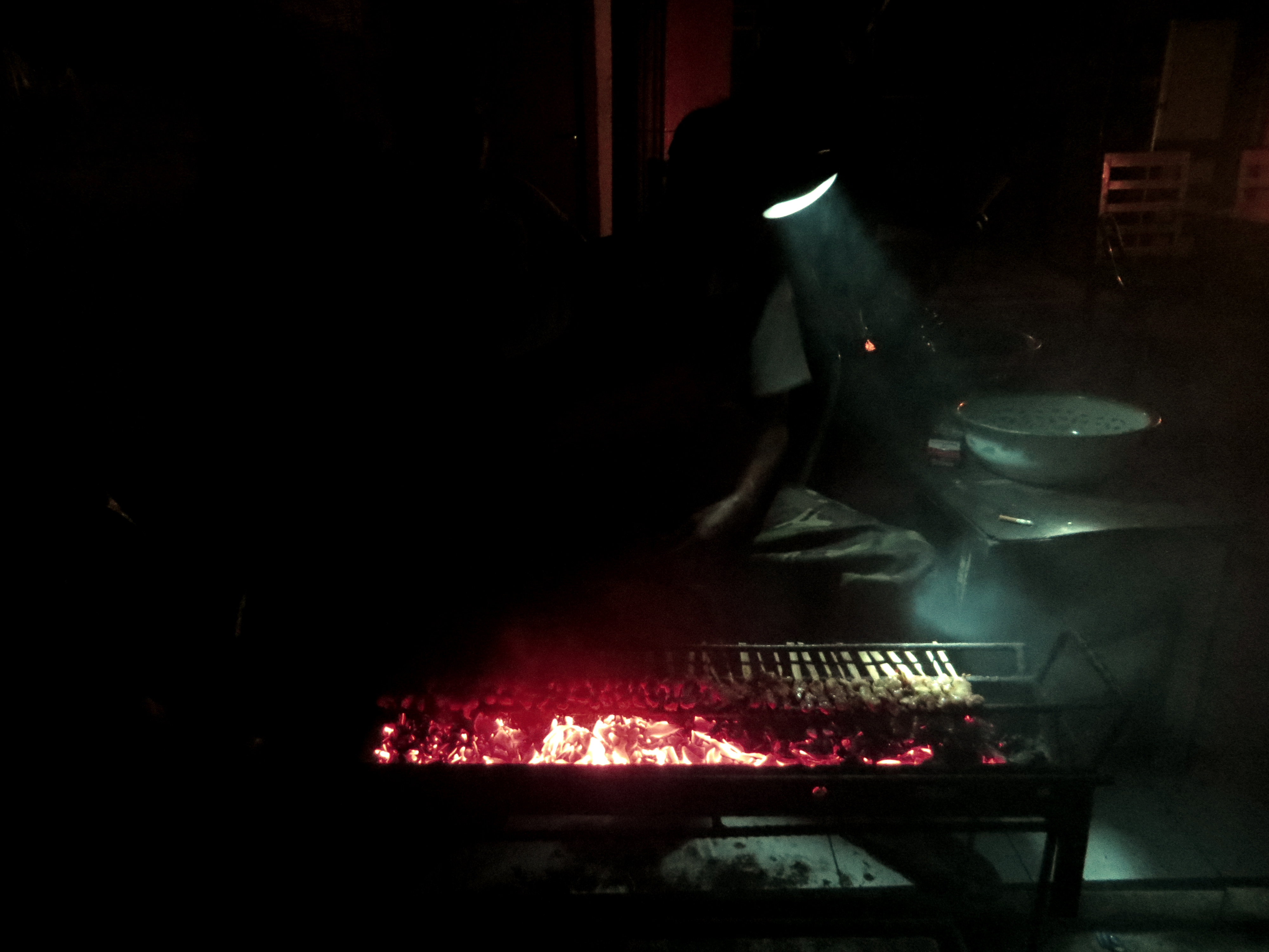 The smell of a mosquito coil is unmistakable. I must be passing a shop or someone’s house. I can’t tell. It’s pitch black. As I pass an alleyway I squint to see a pair of eyes peering back at me, the glow of a cigarette burning brighter as he or she takes a long, deep drag. Further down the street the headlights of a dozen mopeds dance in symphony like fireflies, swerving back and forth back and forth to avoid potholes on the ground. They succeed. Smoke fills the air, a heavy concoction of charcoal and peanut and burning meat. A man is sitting by the side of the road with a torch strapped to his head, methodically fanning row upon row of chicken skewers lying on top of red-hot embers. “Satay. You want satay? Come inside sit down,” says his wife. At least I think it’s his wife. Maybe it’s not his wife. Who knows. ‘Inside’ is merely a plastic chair on a porch. I sit down beside two girls who look like her daughters. At least I think they’re her daughters. Maybe they’re not her daughters. Who knows. “How many you want, eh?” I ate only an hour ago, so I order ten. I wait. It’s dark. The wife lights a gas lamp and sets it on the table. I ask when the power’s going to come back on. “Always trouble. This is small island. No power. How many you want?” I tell her again, ten please. The husband hands her ten satay sticks which she carefully wraps in a banana leaf and hands to me. The taste is undescribable. Delicate. Charred. A nostalgic mix of sweet smoke and subtle spice. She smiles at me, “taste good yeah?” All I can say between mouthfuls is, “ten more please.”