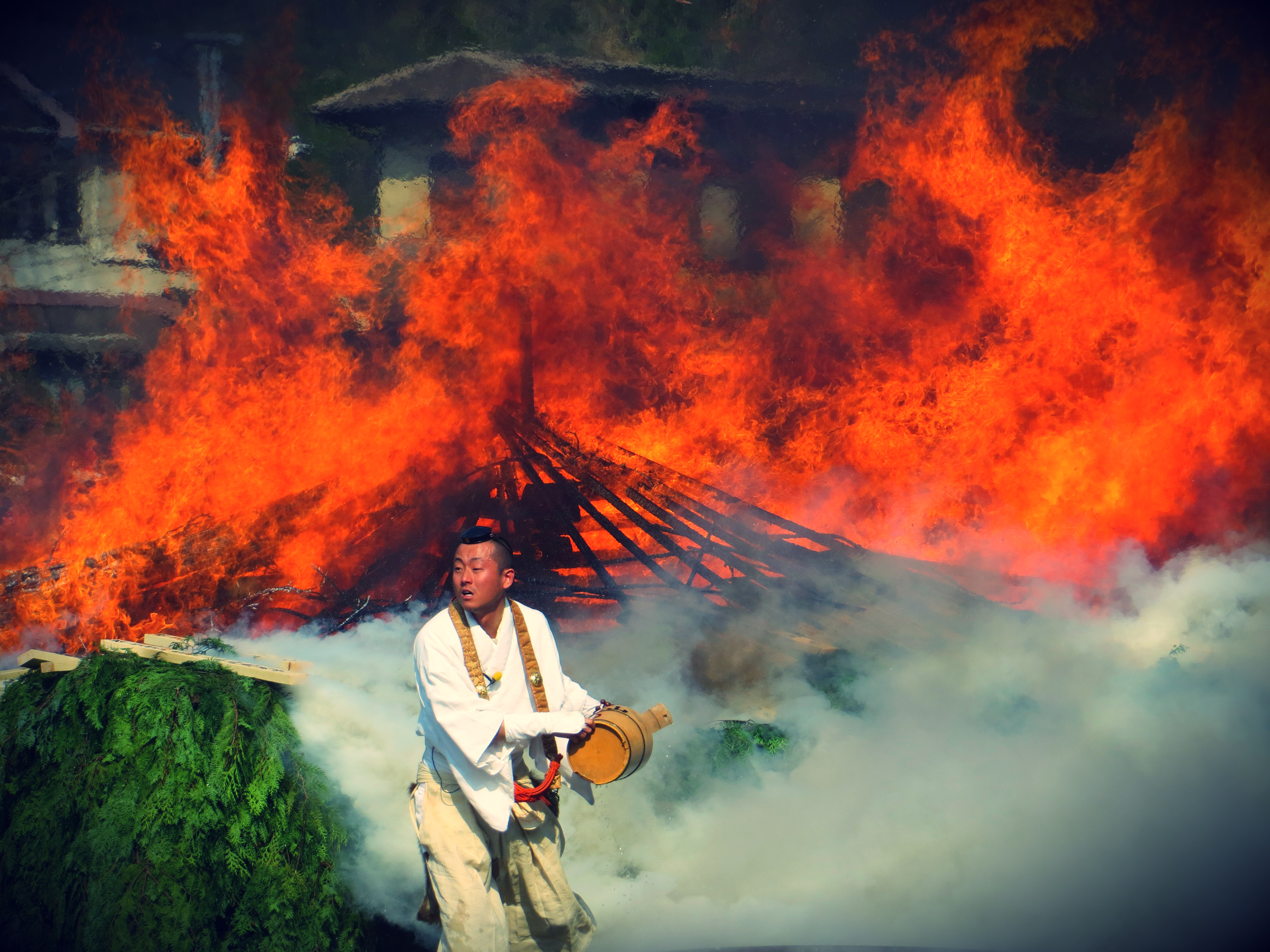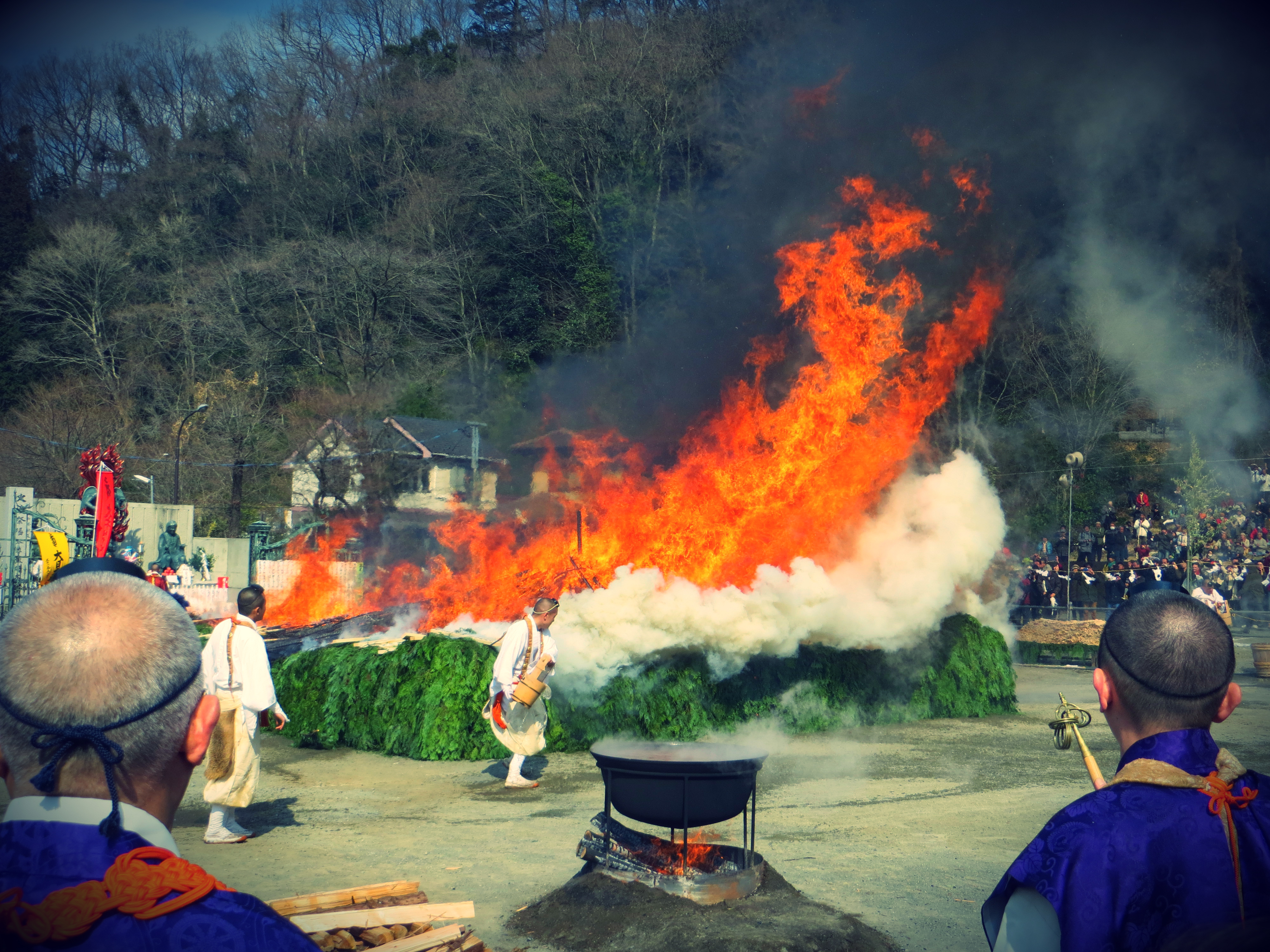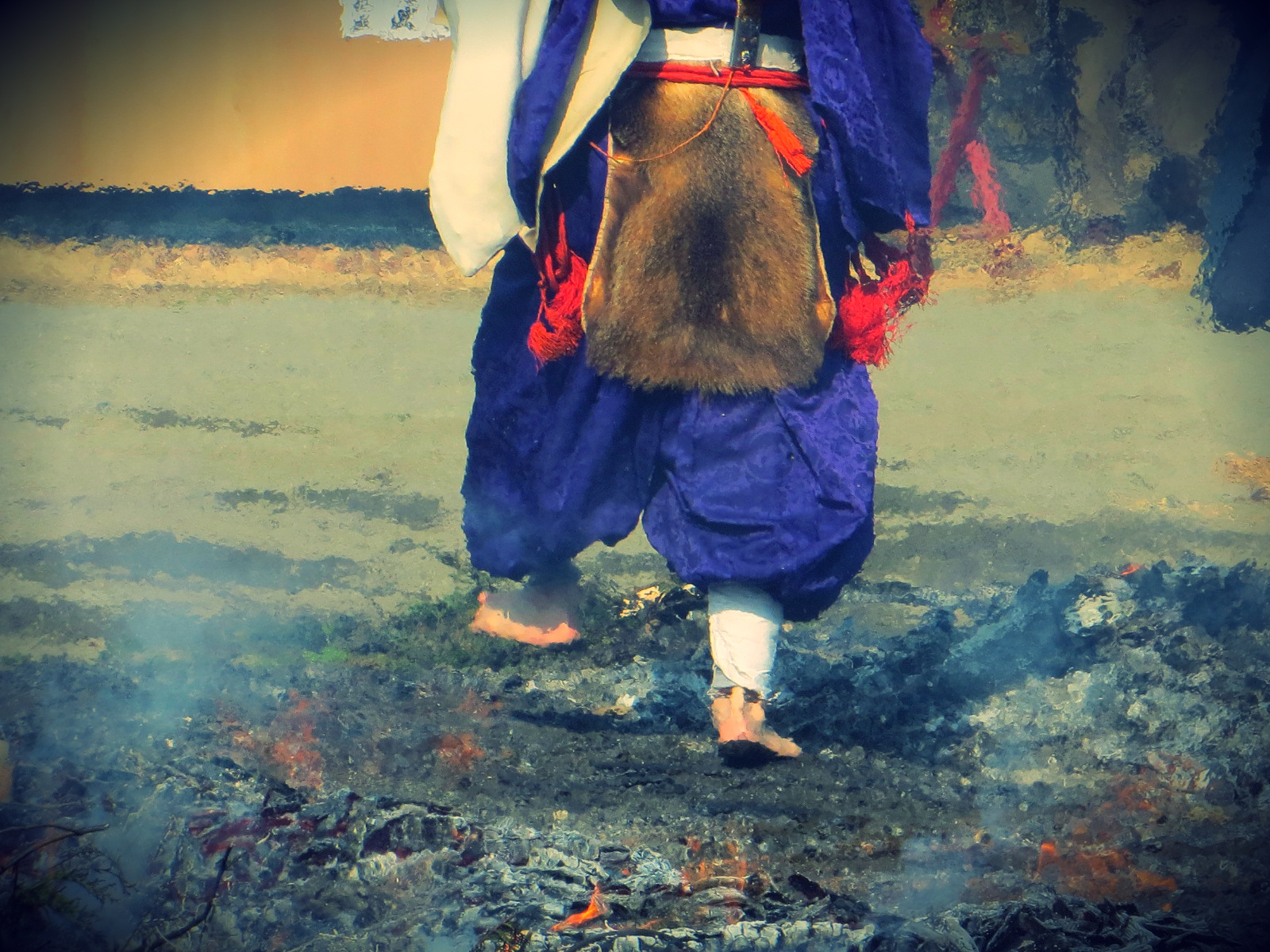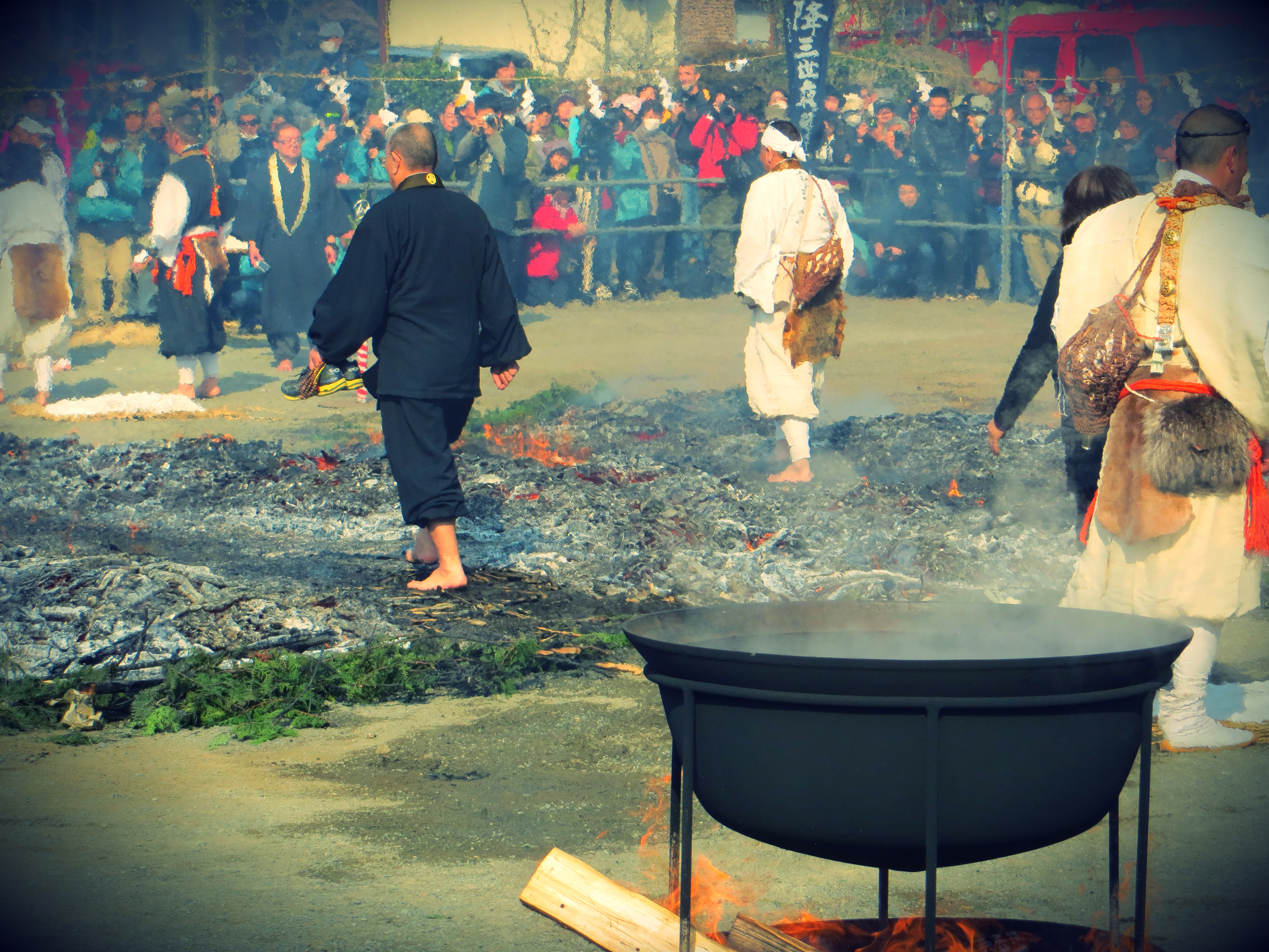 Practitioners of Shugendo (called yamabushi) prepare a sacred fire and behind the blaze dynamically perform ritual processes that are meant to cleanse misfortunes and pray for world peace, longevity and good health. To finalize the ceremony, the yamabushi monks walk through a path of smoldering embers, followed by worshippers who wish to try fire-walking themselves. It is believed that the spectators who simply watch the ceremony will also receive the benefits.