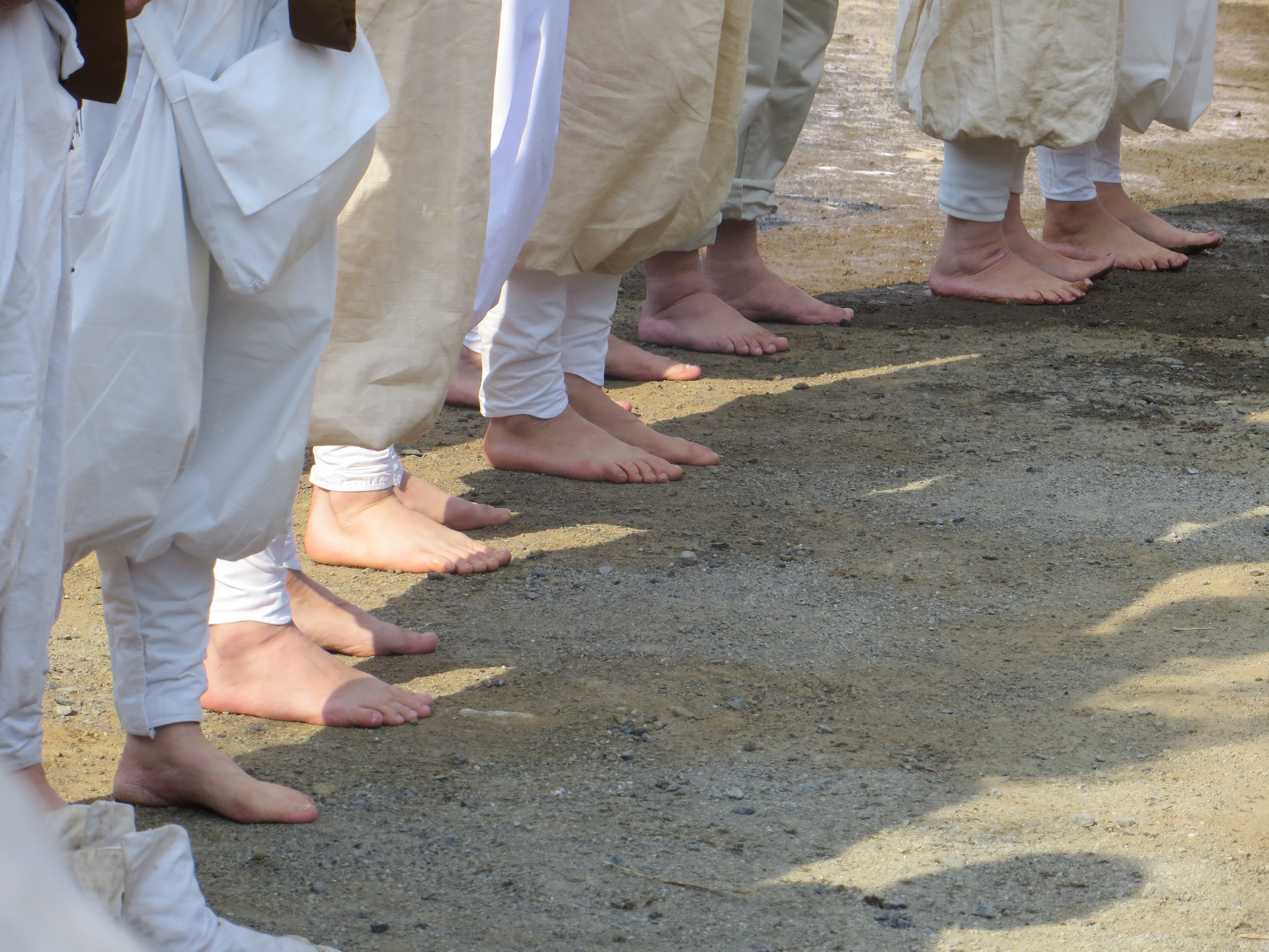 Some of the elder monks are dressed in more elaborate garb, with a number of them blowing Japanese conch shell horns (horagais) to appease mountain deities.