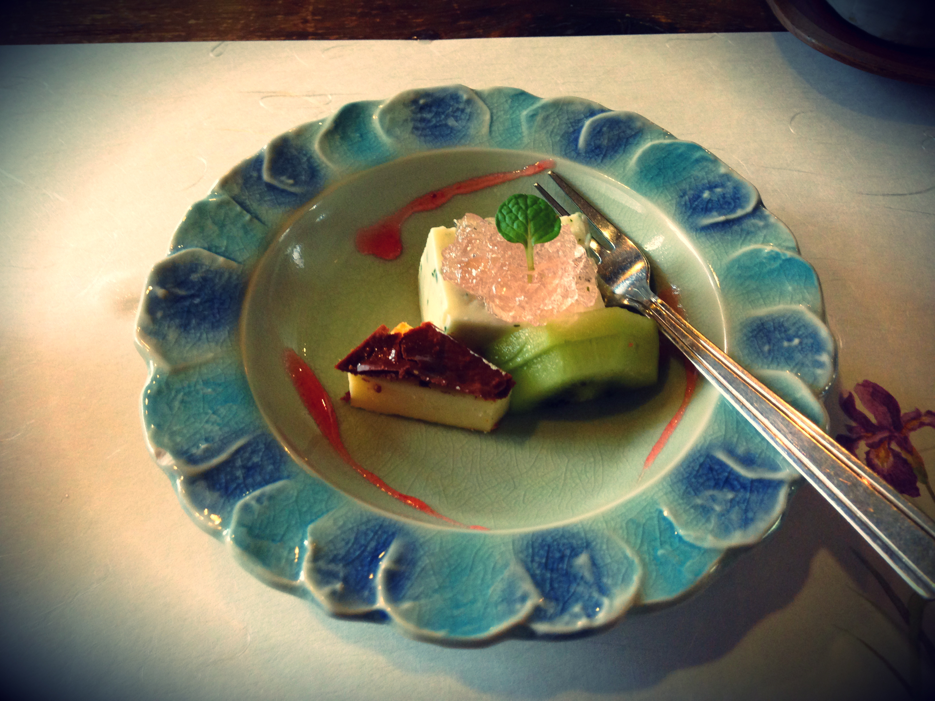 I was lucky enough to be the guest at a rather special lunch recently. I ordinarily can’t afford to eat this kind of food, and I didn’t expect to be treated to such a lavish meal. When I sat down, the menu (above) was sitting in front of me. I thought I had to choose something, but I soon realised that I was getting it all: nine courses of immaculately presented and delicately flavoured dishes. Below is just some of the food, there was more.
