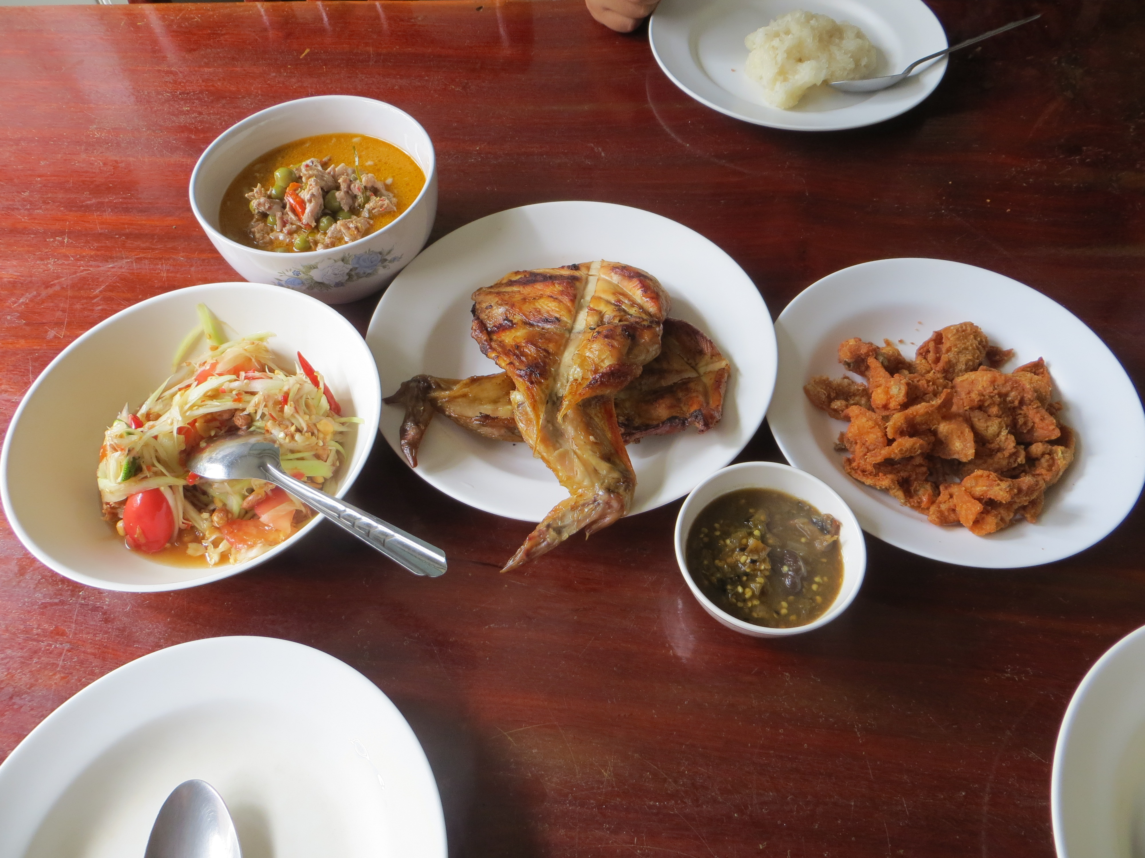 The day revolves around food, with mae (Fanfan’s mum, pronounced ‘Meh’) rising at 5am and making a racket downstairs preparing stuff for the day ahead: cracking coconuts, grinding spices into a paste and getting the rice underway. No one ‘works’ in the traditional sense here. Meh is semi-retired, Fanfan is studying, and Allan works remotely online. With none of us having to get up and go to work, that means the whole day is essentially free time. Saying that, there is always stuff to do around the house: picking vegetables, cleaning up, chasing away big spiders and so on. Every day is different. We sit down about 8am or so and eat our first meal of the day; again at around 12pm and then again 5pm. There are no real set times though. Eat when you’re hungry. Different dishes are prepared throughout the day and left on the kitchen table. What we don’t eat at breakfast, we finish at lunch, and so on. I normally eat a lot, but even for me the sheer variety of stuff on offer is mind blowing. In the course of a day living here it’s not unusual to eat ten different dishes, all homecooked and amazing.