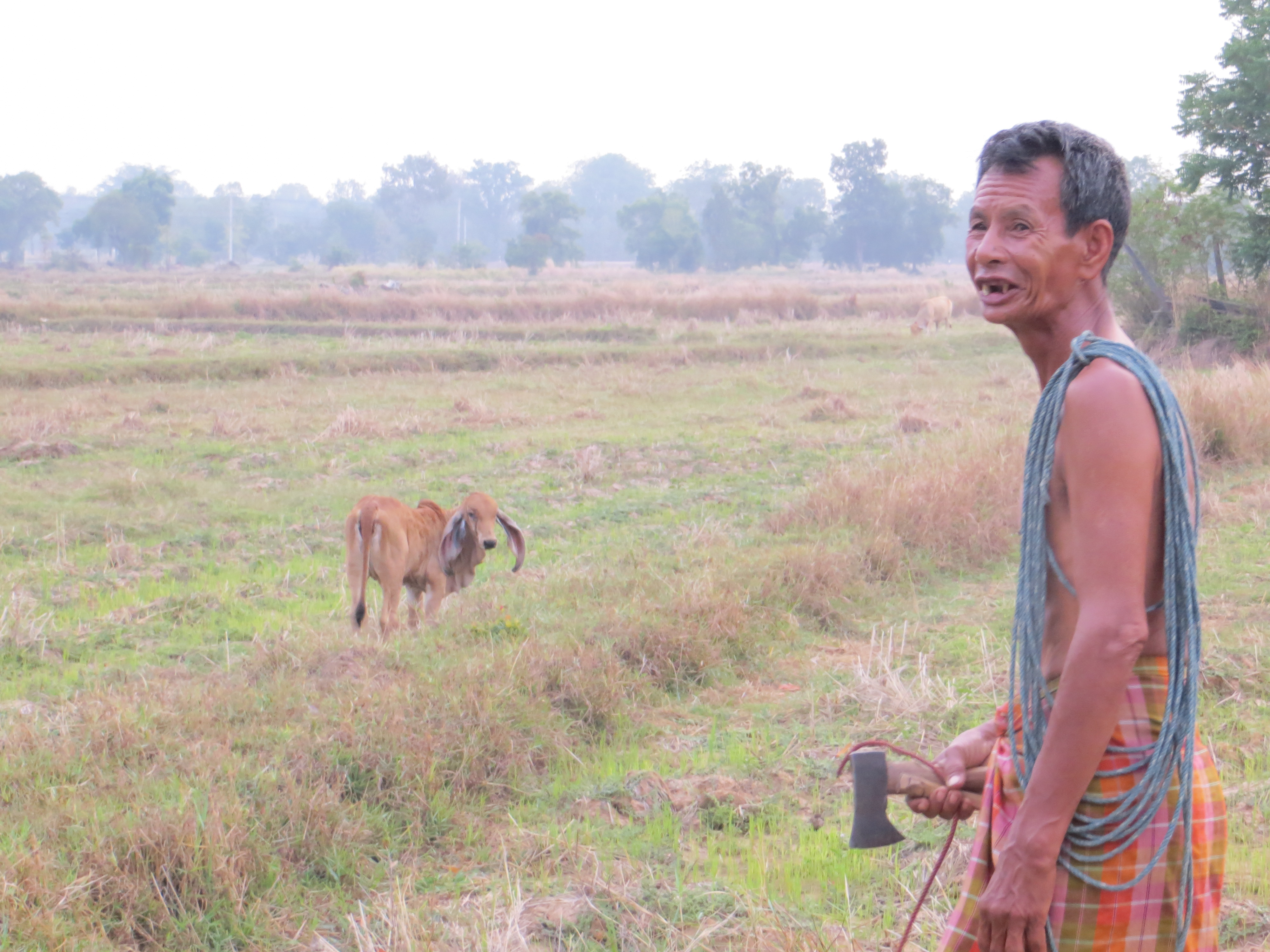 On one particular day we rise at 5am and head out on our bikes before sunrise. As we cycle along dirt tracks locals eye us suspiciously and then smile: farang (foreigners) are just not a common sight round these parts. We take off in to the rice fields and come across a traditional Isaan house: two stories with the bottom left empty for storage and so people can lie about in the shade. A farmer wearing a sarong is herding cows into an adjacent field and we stop to chat to him for a bit, with him telling us how he will rear the calves until adulthood and then sell them on for as much as 40,000 baht (£800). Geese flap around nearby, as well as a flock of ducks. With the sun coming up and the mist rolling off the grass, it really does feel like we are in the middle of nowhere.