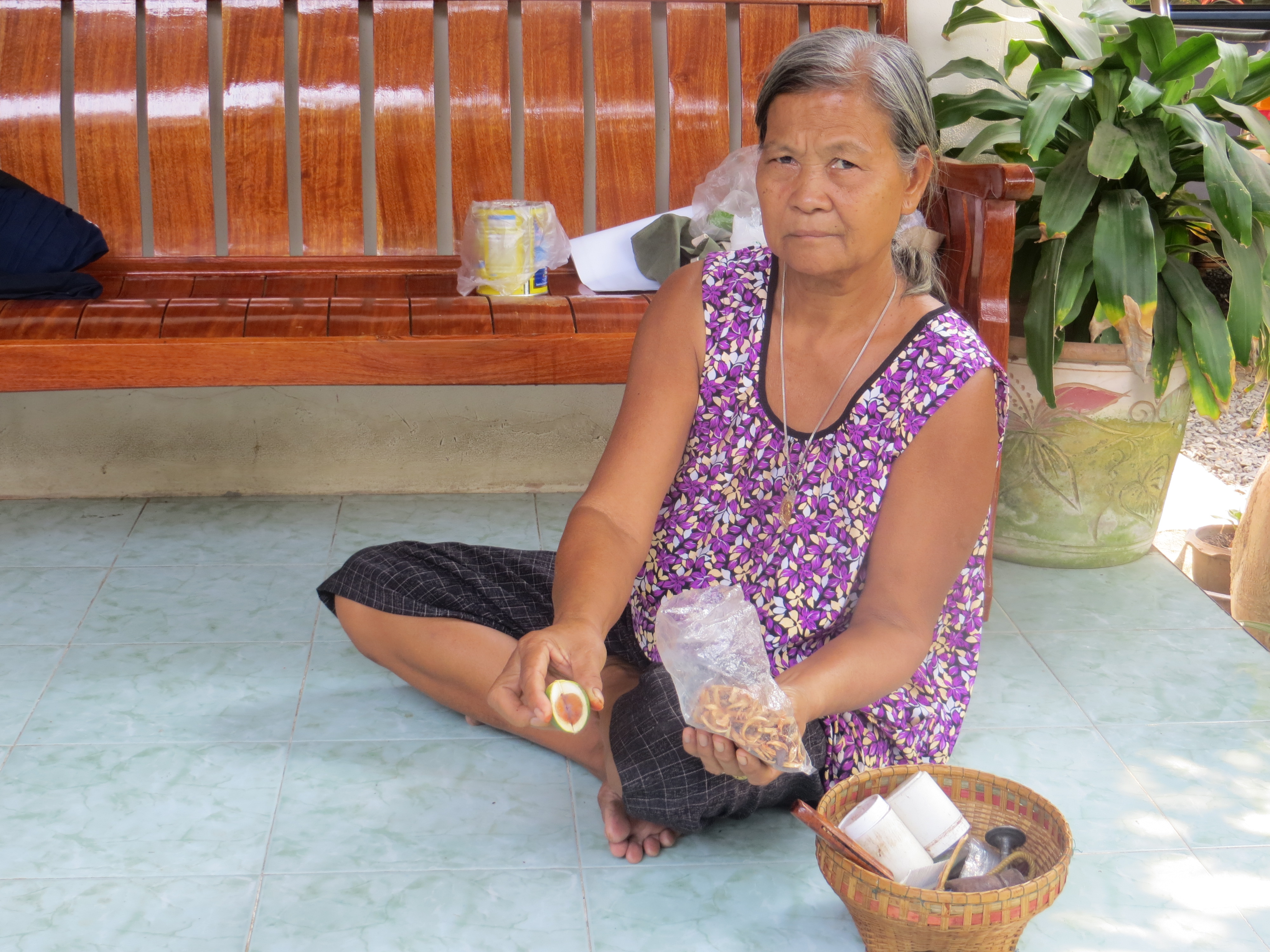 Lazing about one day we went over to Ya Thip’s house to see what she was up to. As always, her betel nut pouch was sitting on the bench and Allan asked me if I wanted to try. Common all around SE Asia, the areac nut is commonly referred to as betel nut, as it is often chewed wrapped in betel leaves. It acts as a mild stimulant, causing a warming sensation in the body and slightly heightened alertness, although the effects vary from person to person. For me the experience was a good one: I enjoyed watching the preparation, and the actual chewing of the stuff wasn’t too bad: it had a slight aniseed taste, gave me a bit of a buzz and I could see why it could become quite addictive. Like chewing tobacco, you spit out the juice which is bright red. That’s why so many people in SE Asia have red/black teeth – Yai Thip included.