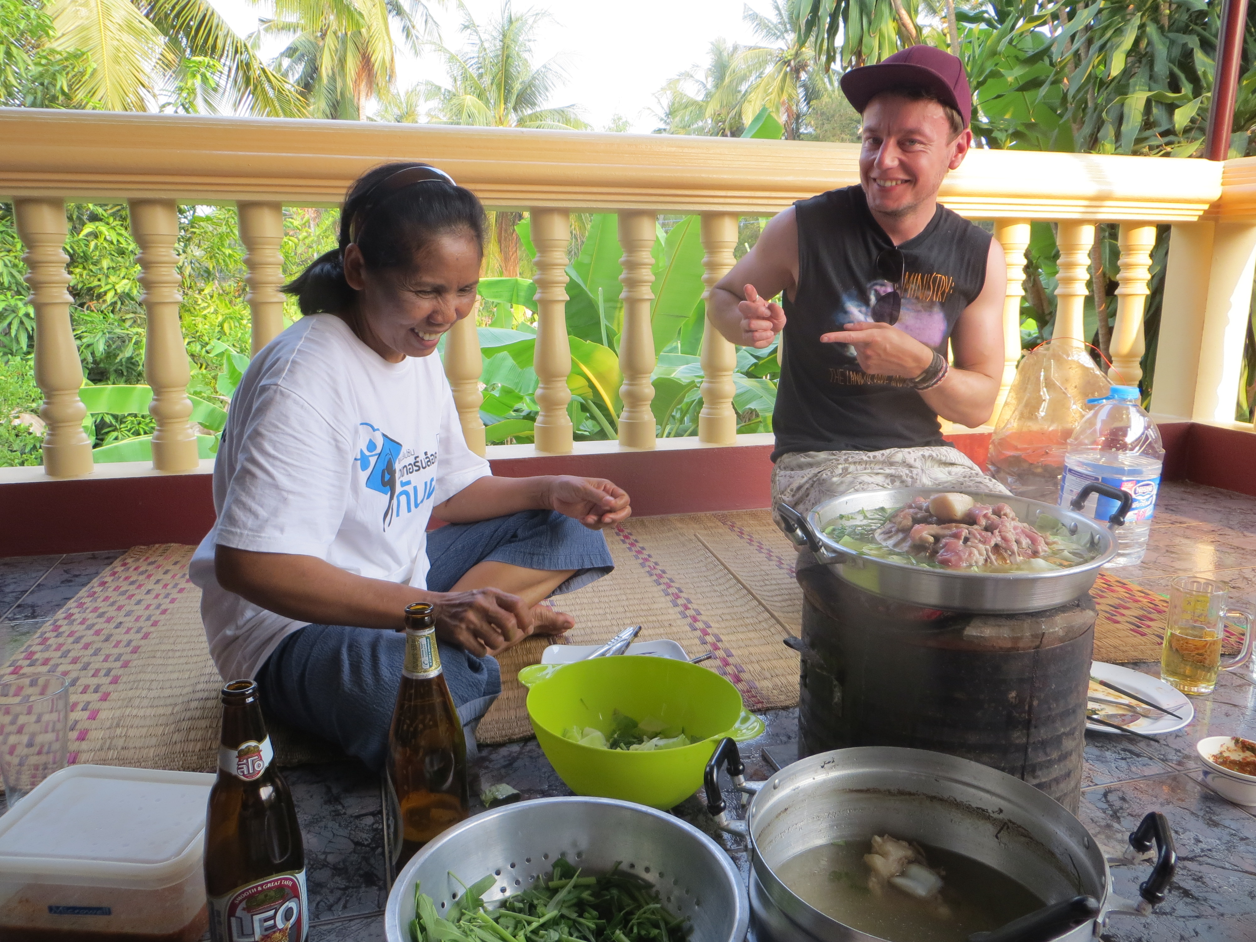 With daytime temperatures reaching the dizzying highs of 37 degrees, when the sun finally begins to set we emerge from the house to sit on the balcony with its welcome breeze. We bring the charcoal fire up with us and eat mookata: pork BBQ cooked on top of a skillet surrounded by a broth with vegetables. We sit up here for two hours working our way through 2kg of meat, drinking beer and sipping Lao Khao, a cheap and potent rice whiskey.