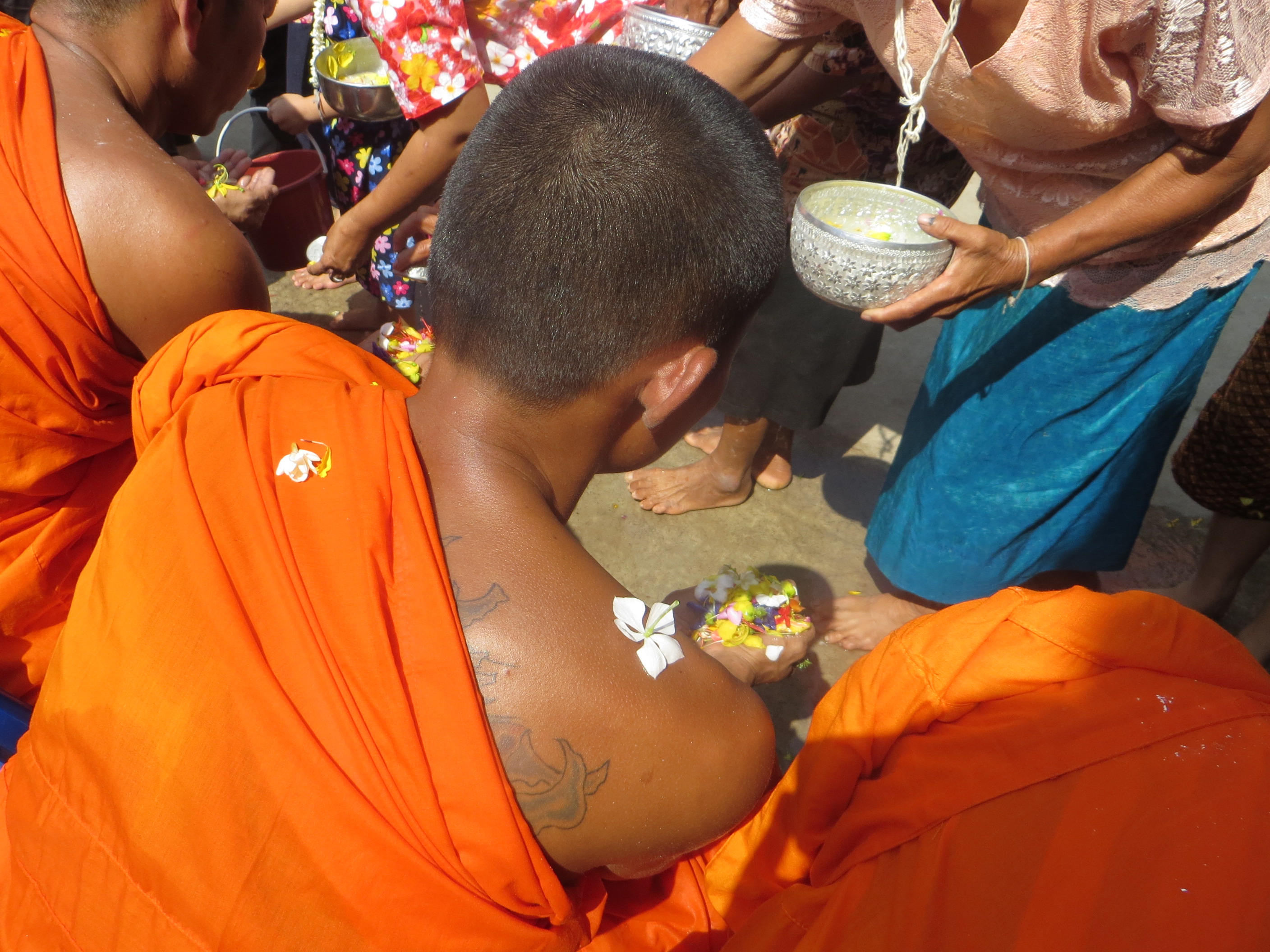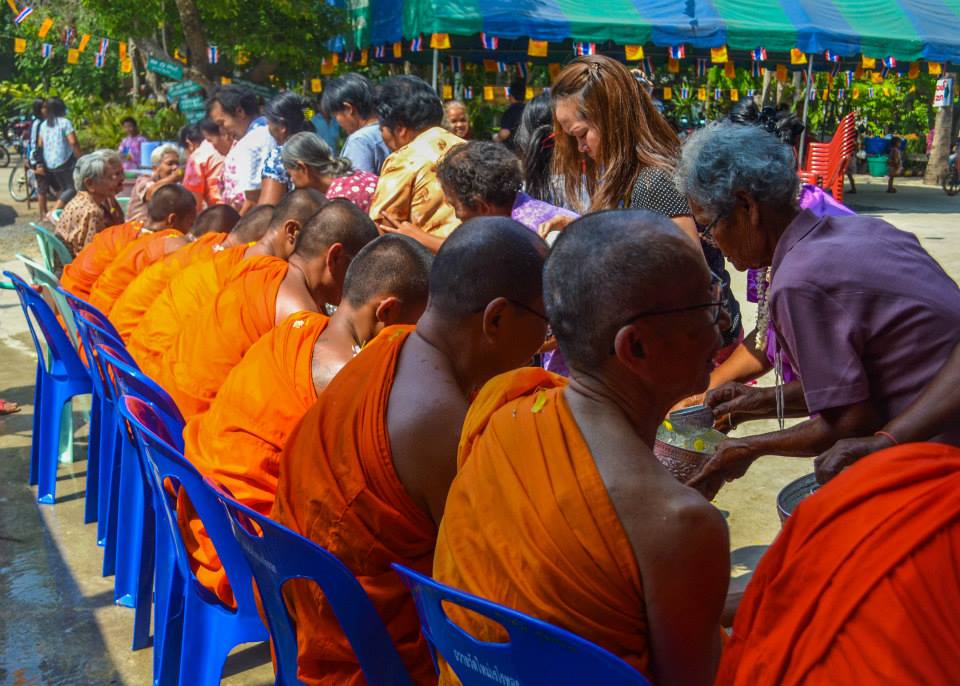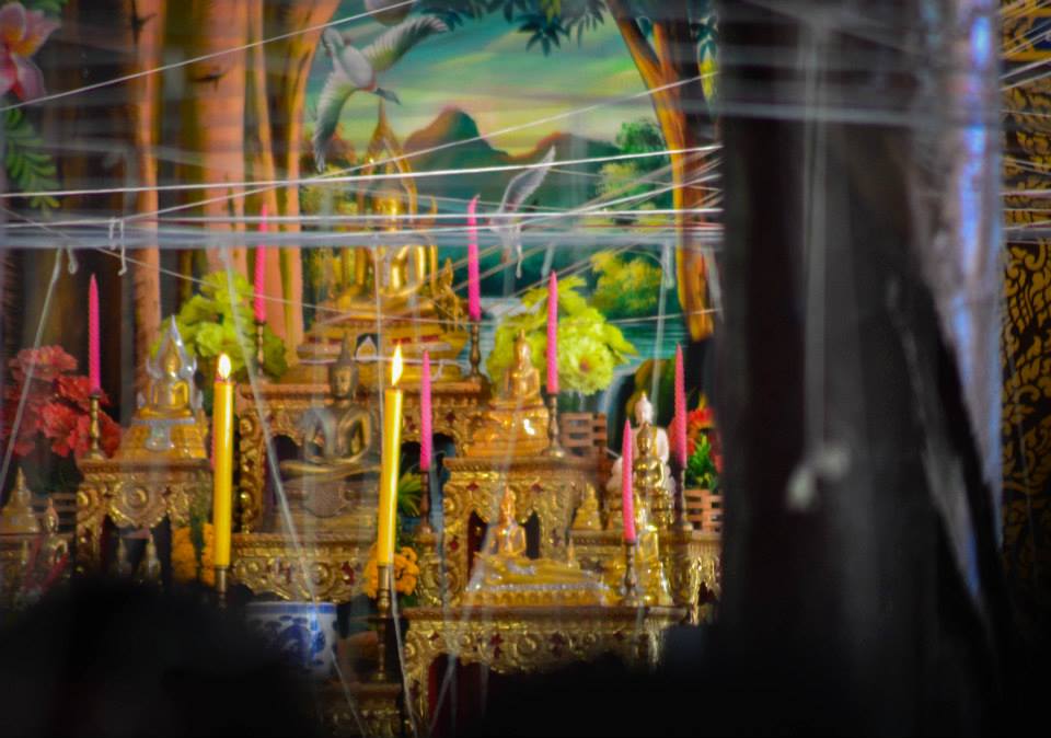 On the 14th we head to the local temple and participate in Song Nam Pra – a ceremony where sacred thread (sai sin) draped from the ceiling connects all of the people in the temple together. After hypnotically chanting for over 90 minutes, the lead monk works his way through the crowd and splashes holy water over the crowd, the whole ceremony symbolic of your karma being born again. Similar to the Rod Nam Dam Hua we performed in the village, we queue and pour fragrant water over the monks’ hands and feet. The water passes through the monks’ hands but the flowers remain. Children and old people approach me and want to perform the ceremony on myself, while others pour water down my back and bless me.