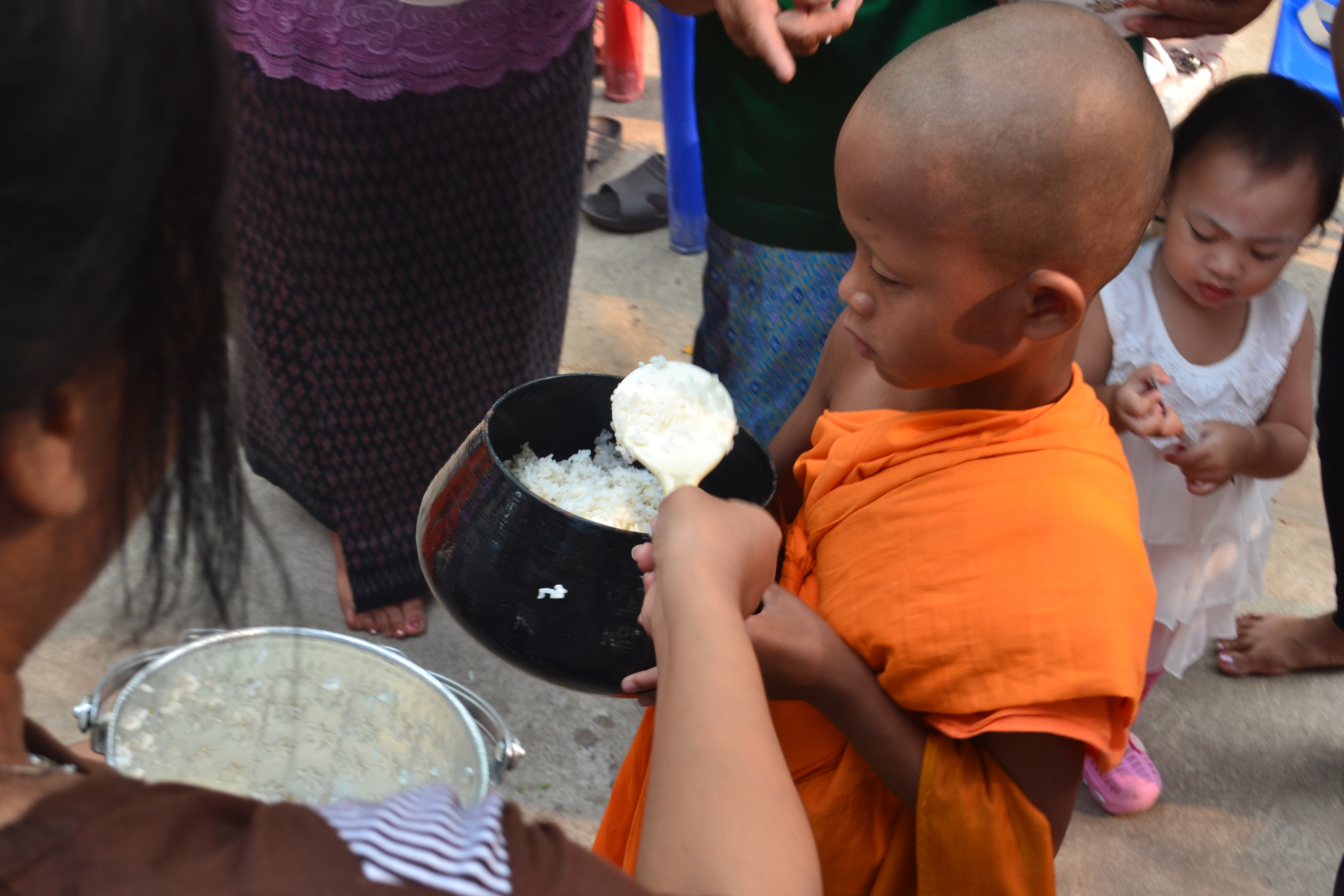 Waking early on the day before Songkran, we put on long pants and head to one of the largest temples in the neighbourhood to perform bintibat or almsgiving – offerings to the new monks who were ordained the previous day. In Buddhism, almsgiving is the respect given by a lay Buddhist to a spiritually-developed person (such as a Buddhist monk or nun). It is not charity as presumed by Western interpreters; closer to a symbolic connection to the spiritual realm. I guess in its simplest form this means that by people relying on monks for spiritual guidance, and monks relying on people to support them with offerings, both parties exist in harmony. Eighty monks were involved in the procession, with us having to spoon rice into each of their bowls as they passed.