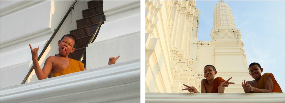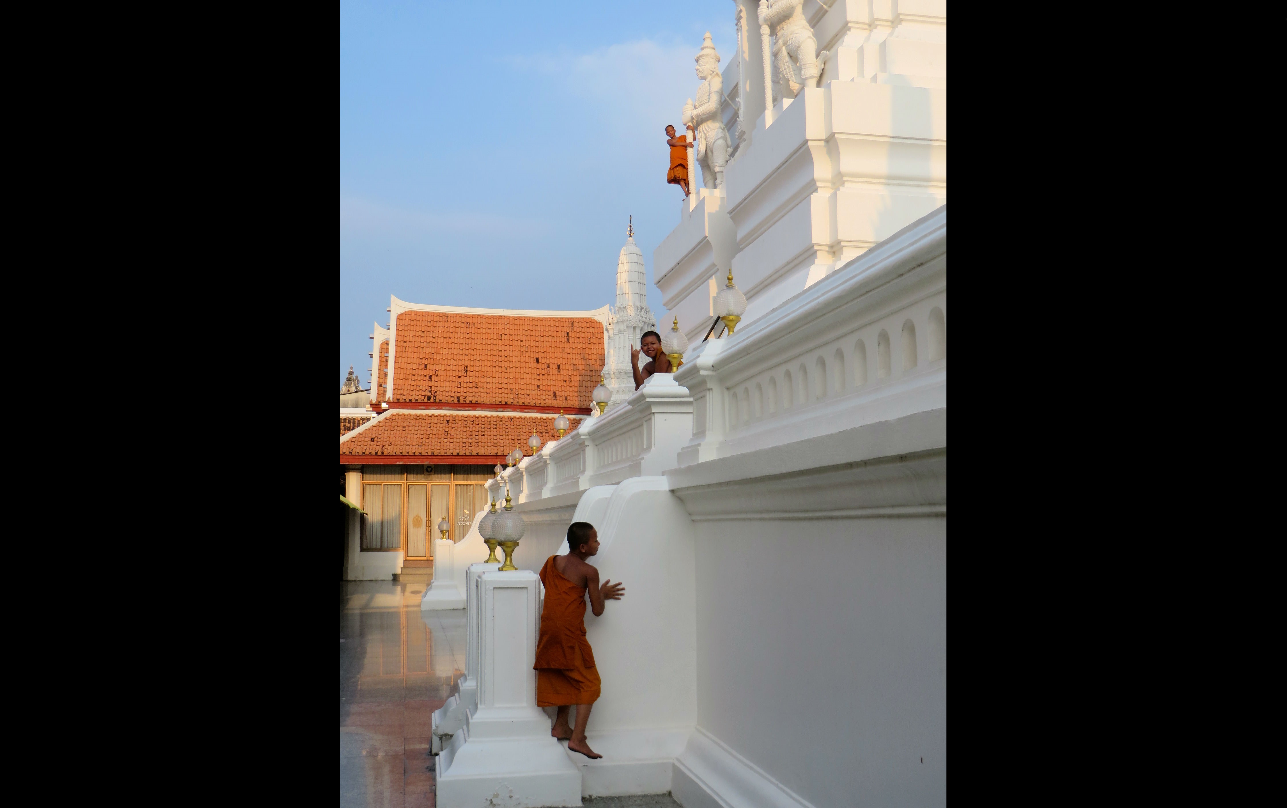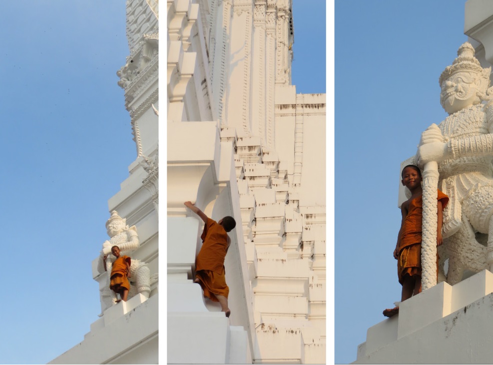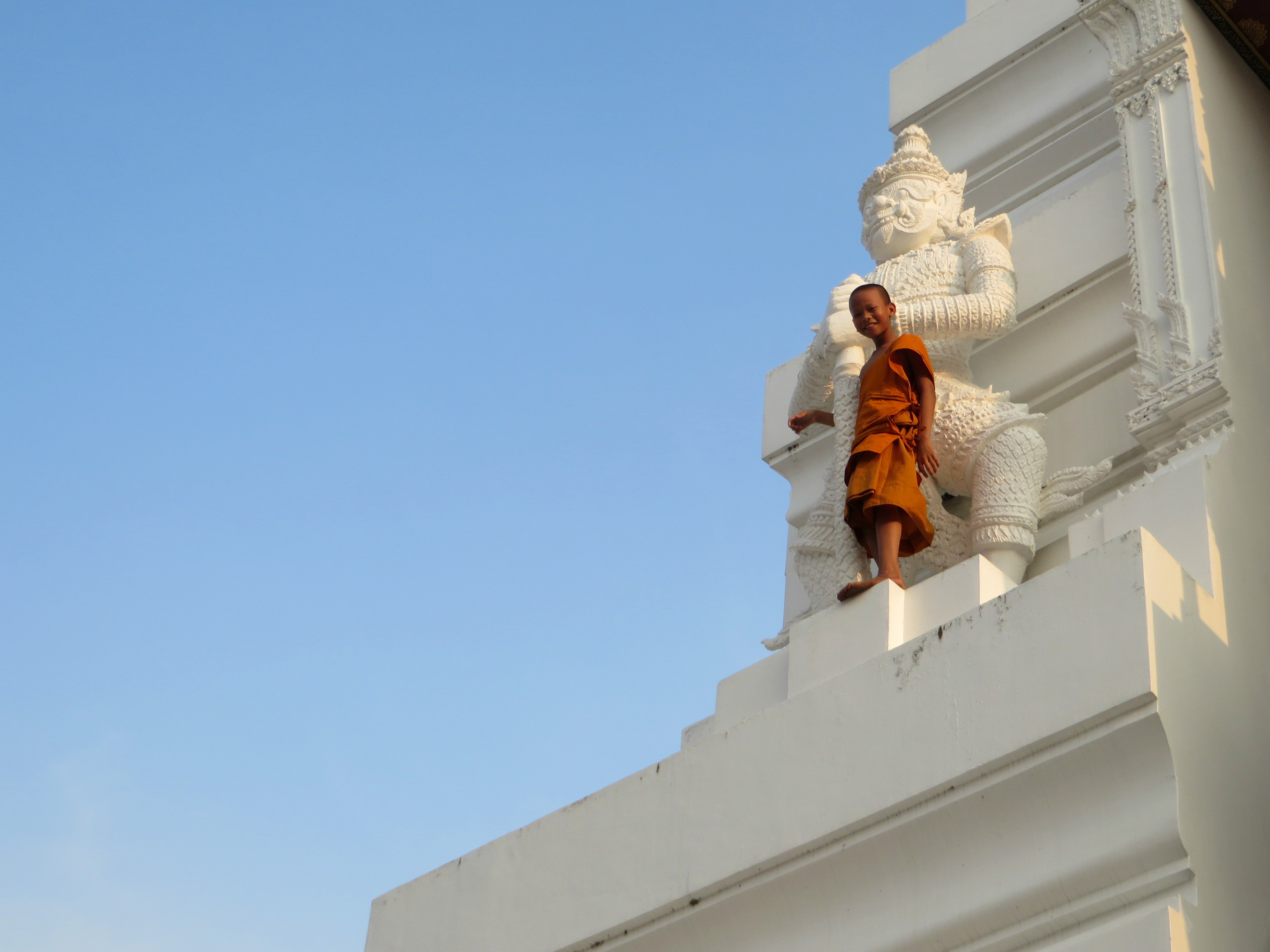 One day while ‘cycling for my dinner’ I end up in the grounds of another temple complex. This one is very quiet but it’s absolutely beautiful, with a a flock of sparrows flying amongst all the statues. In the distance I see a huge gleaming white stupa which I later find out to be called Wat Mahathat Worawihan. I have to cycle through a small row of houses to get to it, with local people pointing the way. Inside the grounds of this stupa I can smell incense and the silence is only interrupted when a monk starts ringing a bell and chanting. A group of young monks run past me who are playing hide and seek. I watch them for a while with some of them climbing up the huge structure like a makeshift climbing frame. The next day I would see these kids again at a different temple, all of us smiling at the fact we met again.
