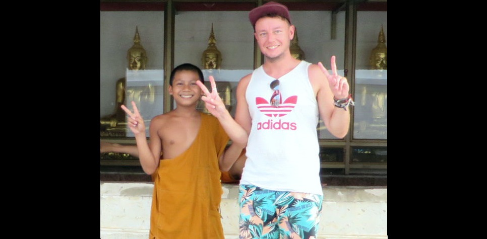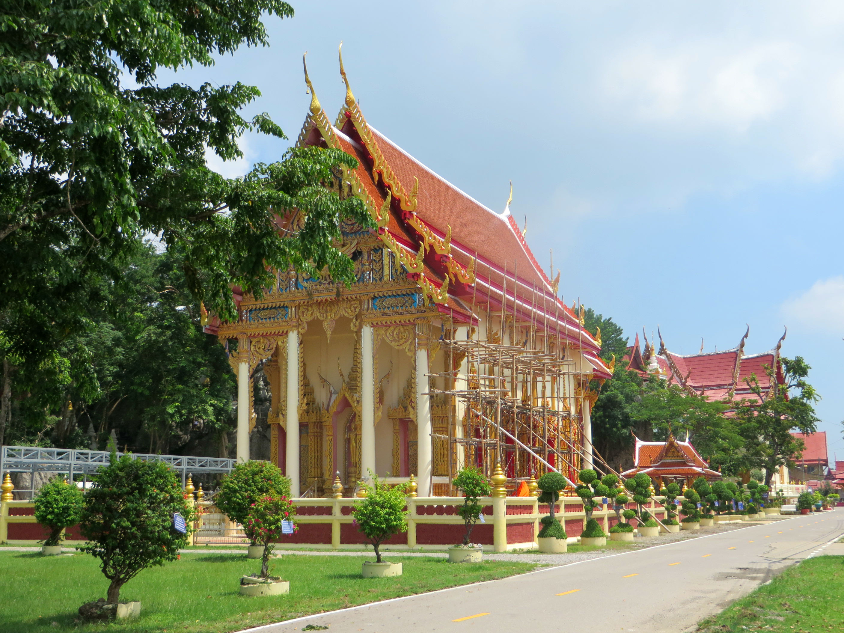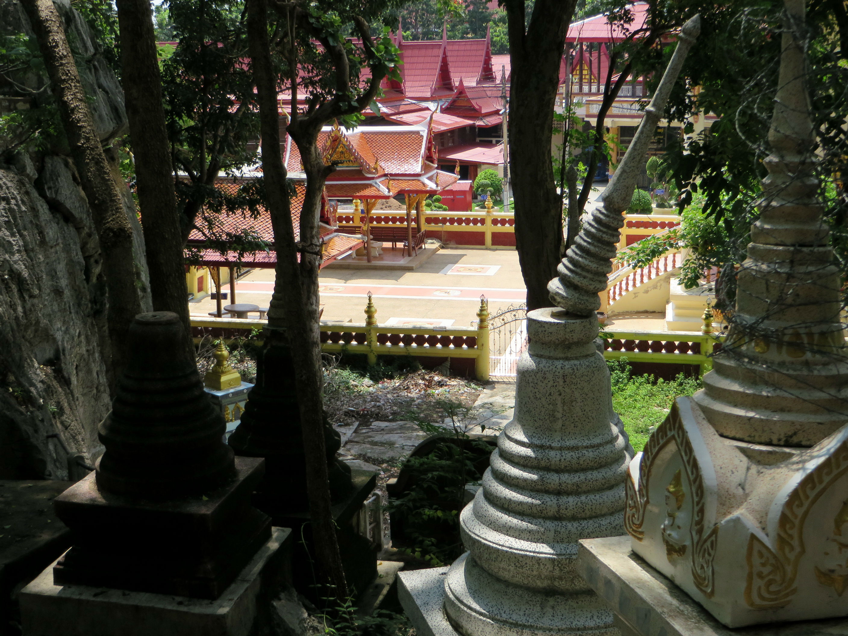Just down the road from here I find myself walking around a neglected temple graveyard. Vines and jungle growth have begun to swallow the once-ornate tombstones, and I walk while staring at my feet in case of snakes. It’s hot and humid, and the overnight rain has left the place looking even more dishevelled than usual. I have a close encounter with a couple of stray dogs but you have to just look confident and walk past them. (Temples in Thailand often have about 20 dogs roaming the grounds – abandoned by their owners, the monks at the temple take them in and feed them but as a result they become fiercely territorial and don’t like strangers threatening their space.) I spot a monkey climbing on top of one of the houses trying his best to get inside a coconut. He doesn’t seem to be having much luck.