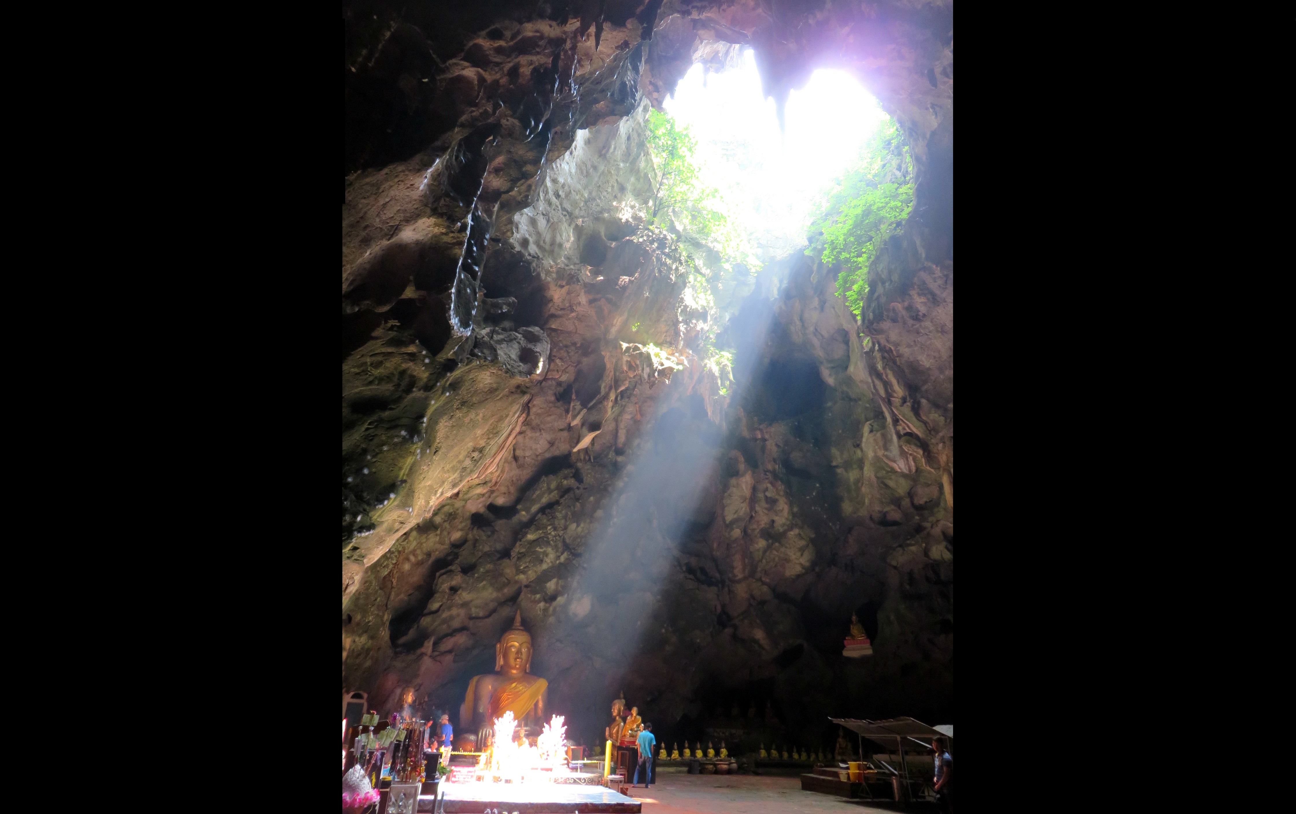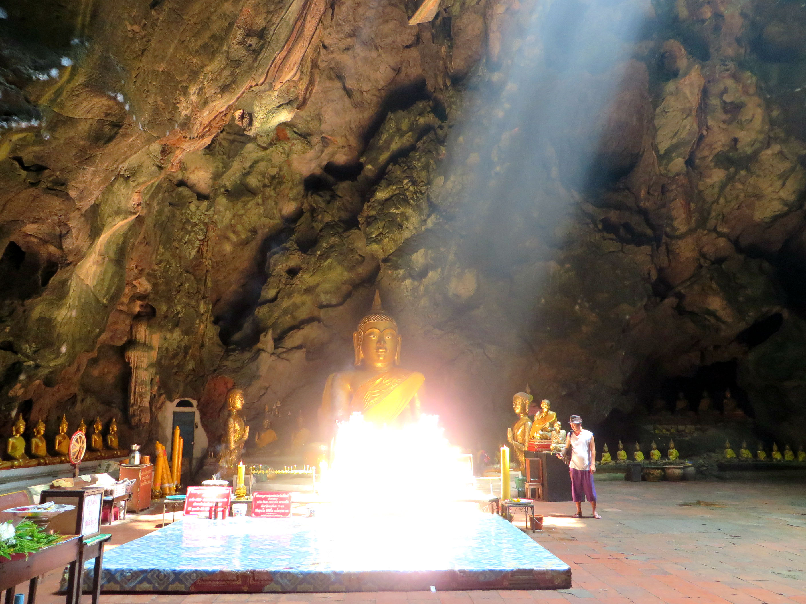 One day I cycle past flooded rice fields up to Khao Luang Cave and dodge monkeys as I descend down into the cavern. I arrive at midday and it appears this is the perfect time to visit, with the light shining down through the cave in a single beam and splashing the Buddha with a golden glow. Down here you will find local people praying, along with nuns dressed in ceremonial white robes. Entrance is free.