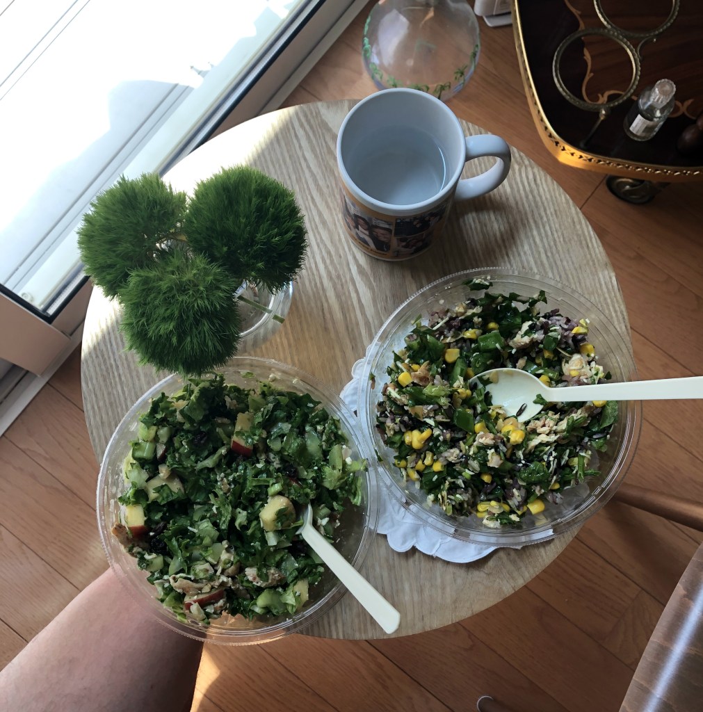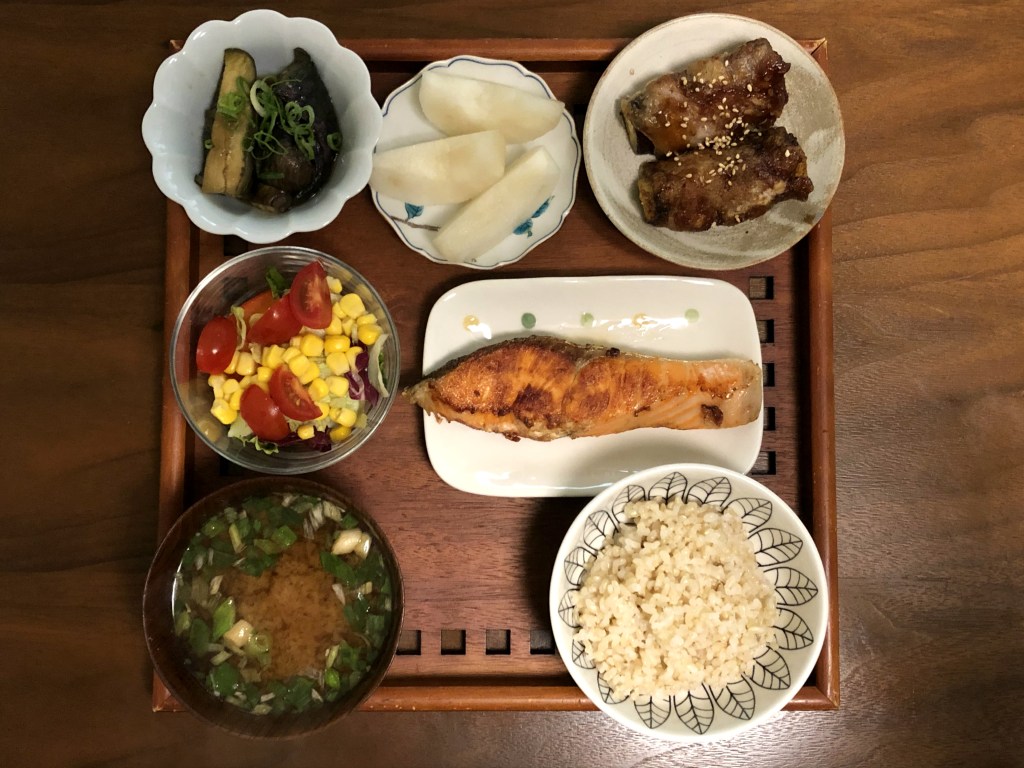 A healthy homecooked meal, clockwise from top left: marinated eggplant; Japanese pear; sweet potato wrapped in pork; salmon; brown rice, miso soup; salad