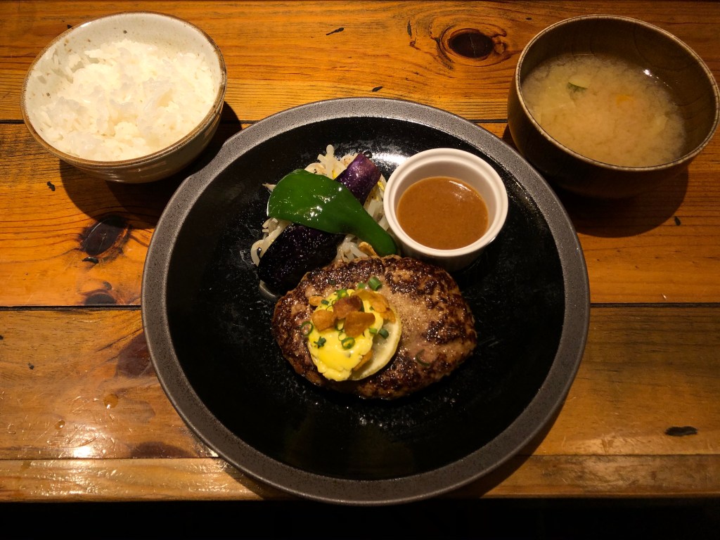 Japanese hamburg steak with garlic butter. The position of the rice and miso soup made me think of Micky Mouse.