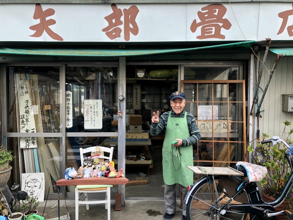 Oh, this was a nice moment! I was walking about Hakuraku just outside Yokohama when this little shop owner struck up a conversation with me, asking where I was from etc. He was excited to bring me inside and show me his shop where he made tatami mats. He’s 85 and still works every day!
