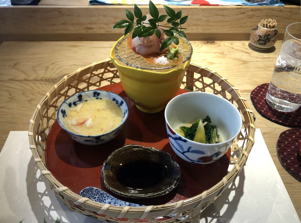I won’t show all the food, but it was a sushi and tempura course, which started off with this beautiful basket. On the left was chawanmushi, a savory egg custard with crab. Then at the top some lovely sashimi.