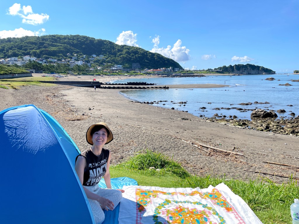 Sick of having to shelter under a sun umbrella, Mrs IKIMASHO was determined to buy a tent this year – look how happy she looks!