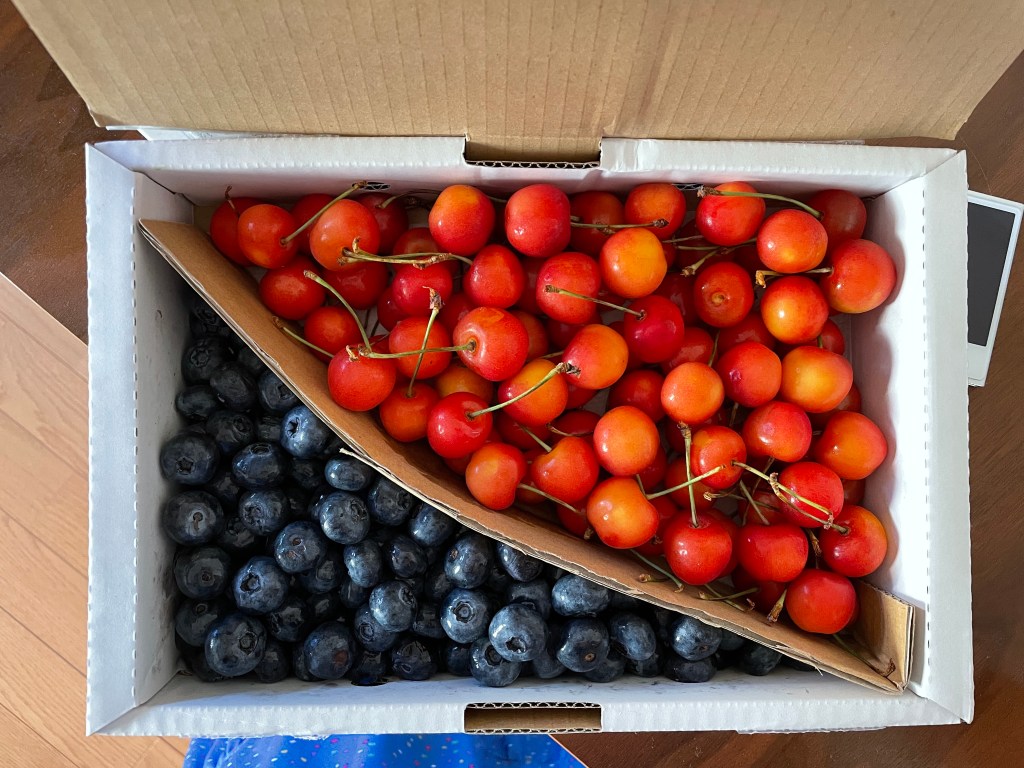 The postman also delivered a package from relatives way up in Aomori in the north of Japan. They sent us cherries and blueberries.