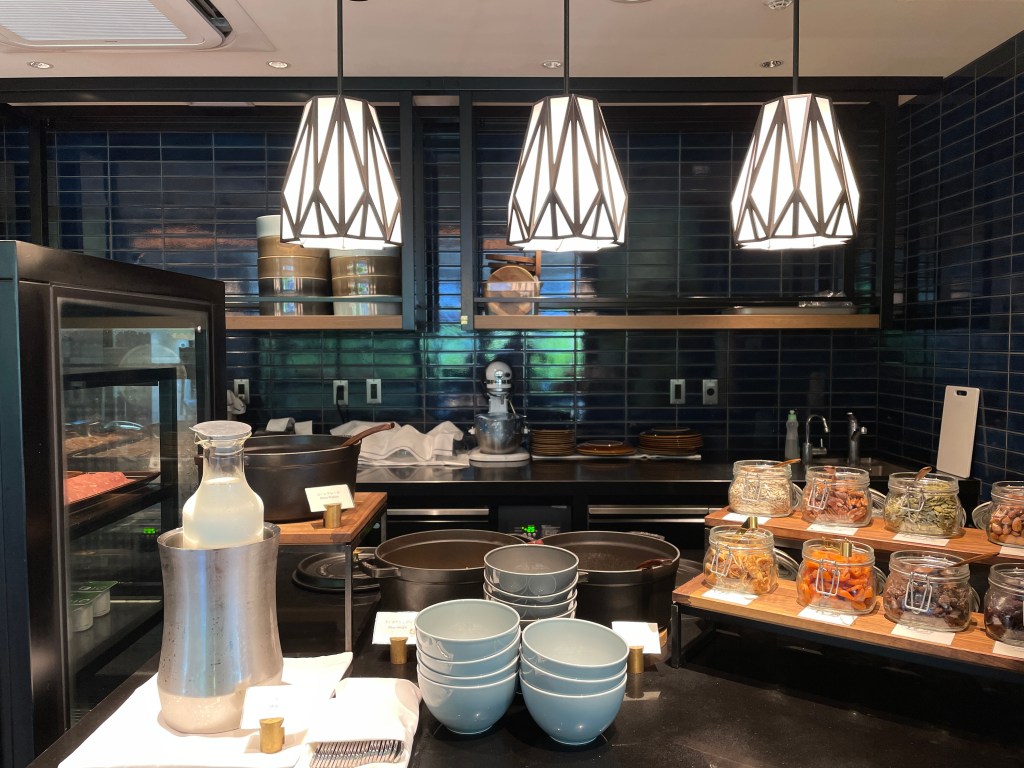 網戸を少し開けたまま、下を流れる川のせせらぎを聴きながら心地よく眠ることができました。翌朝は、露天風呂につかりながら日の出を見たくて朝早く起きました。このように静かでゆったりとしたひと時を過ごせることがこのホテルの素晴らしいところです。フィットネスセンターで運動した後、私たちは朝食を食べに一階に向かいました。朝食ではメインメニューから一品を選ぶ他、ビュッフェには果物、ヨーグルト、パンなど様々な食べ物がありました。お美味しい朝食やコーヒーをいただきながら味わえる、穏やかな雰囲気と溢れるばかりの日差しは素敵な一日の始まりでした。