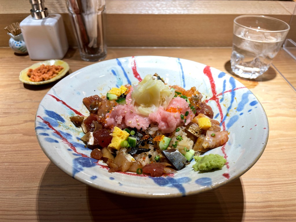 Chirashizushi, also known as scattered sushi. The rice underneath was lightly vinegered, and the green wasabi nice and strong.