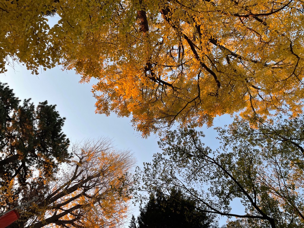 The yellow gingko leaves falling and leaving a carpet wherever they land.