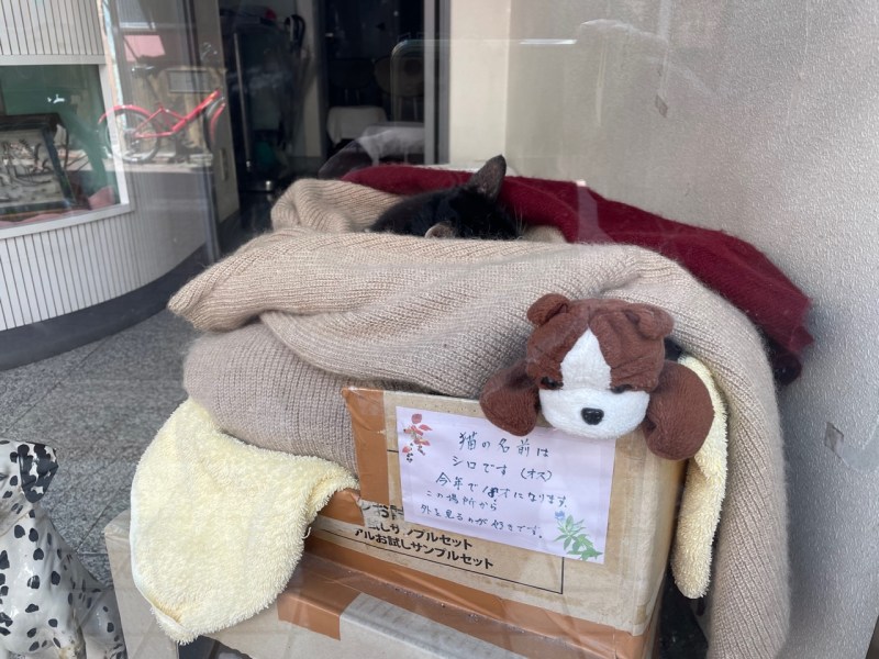 In the window of a random shop to let, we found a cat sleeping – the owners must live upstairs. Kept company by a teddy, the cat is 18 years old, and the note says. ‘This is my favourite spot to sit and watch the view outside.’