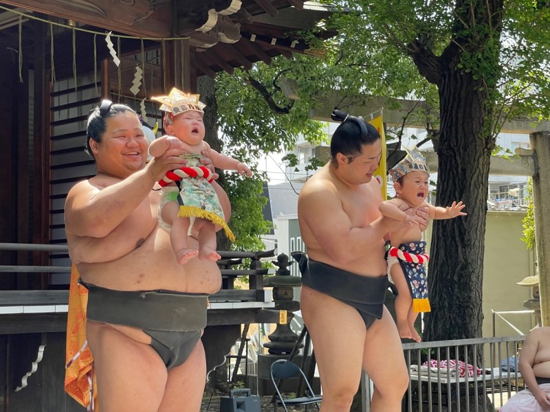 Sumo wrestlers employ a variety of techniques to encourage crying, including bouncing the baby in their arms, making loud noises and funny or scary facial expressions, and chanting “Cry! Cry! Cry!” in Japanese.