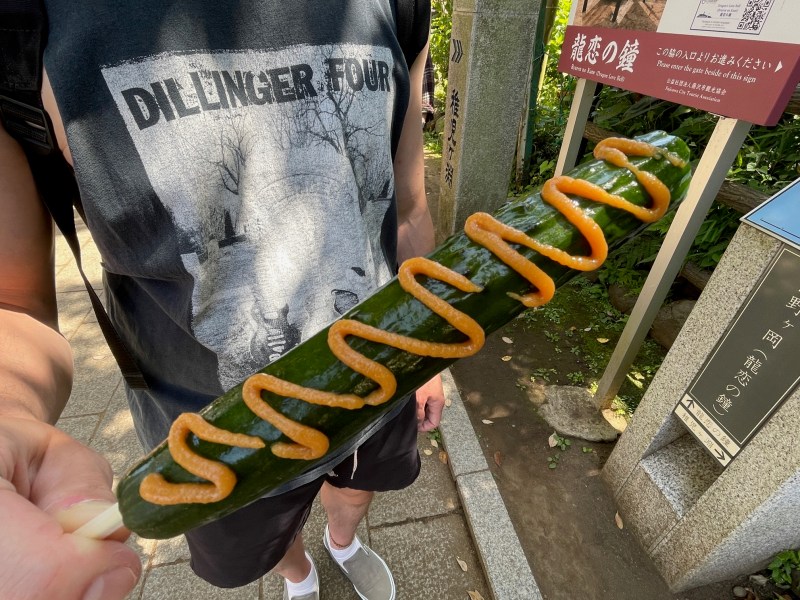 In the warmer months, crunchy ice-cold cucumbers on sticks are popular in Japan. This one was covered in miso and a welcome munch after the short hike.