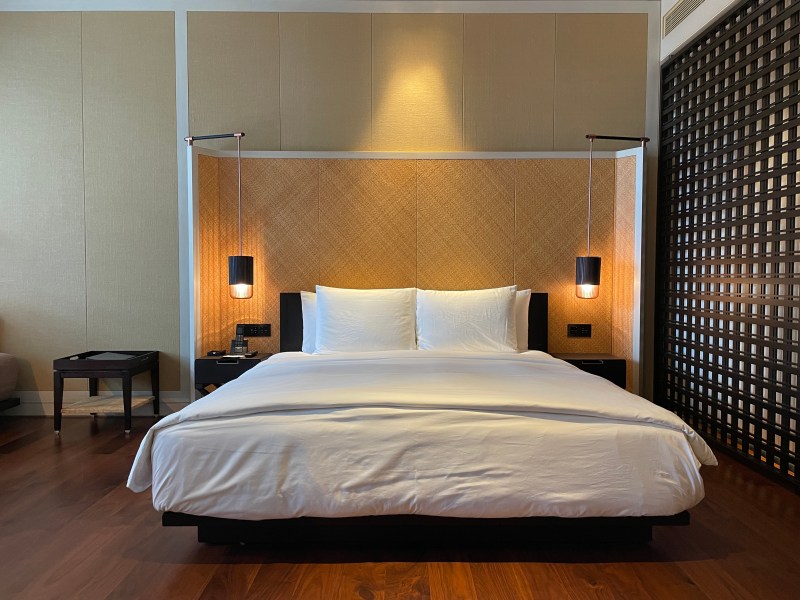 「グランドルーム」という名に相応しい部屋のドアを開いた瞬間、窓のブラインドが自動的に上がりました。これは他の部屋から際立たせる様々な点の中でとても素敵な特徴の一つでした。ダークブラウンの床は、真っ白な布団で引き立てられ、様々な照明が部屋を暖かみのあるオレンジ色の光で照らしていました。ホテル全体で見受けられた美しい籐家具が、時代を超越した高級感と上品さを感じさせられました。