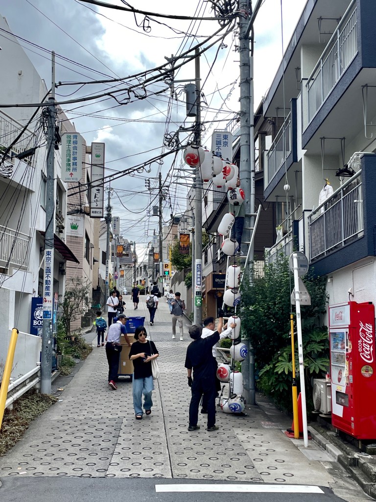 Daily comings and goings on a Saturday morning over in Yoyogi Uehara, including some workers putting up a string of lanterns.