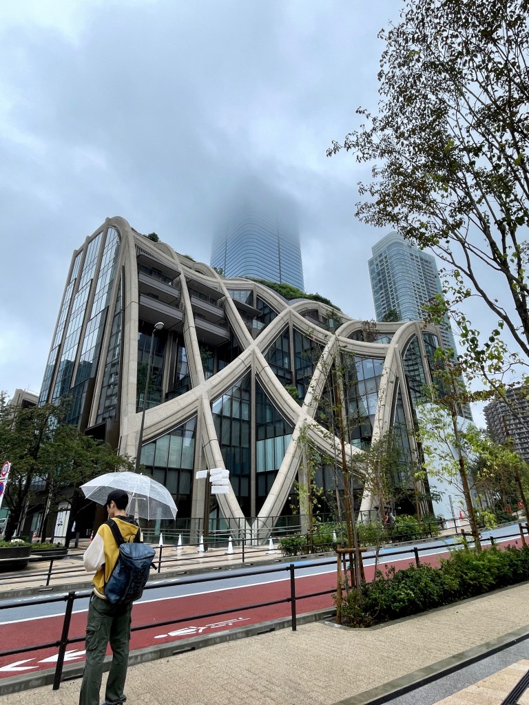 The curves of the new Azabudai Hills complex, due to open next month. The new Mori building also standing in the distance, covered in cloud.
