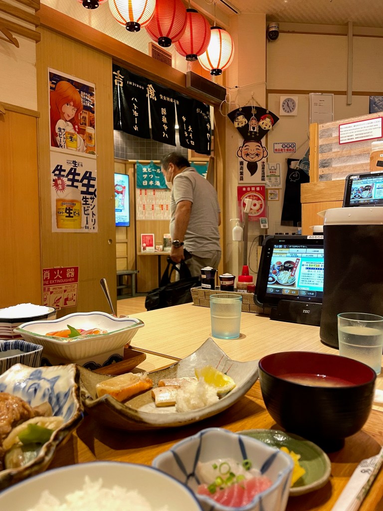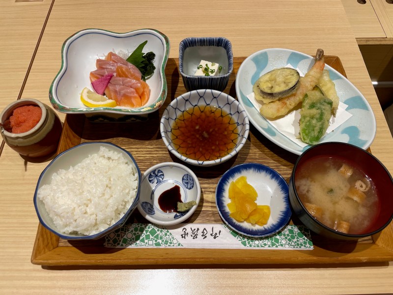 A simple lunch of sashimi, tofu, tempura, miso soup, pickles and rice.