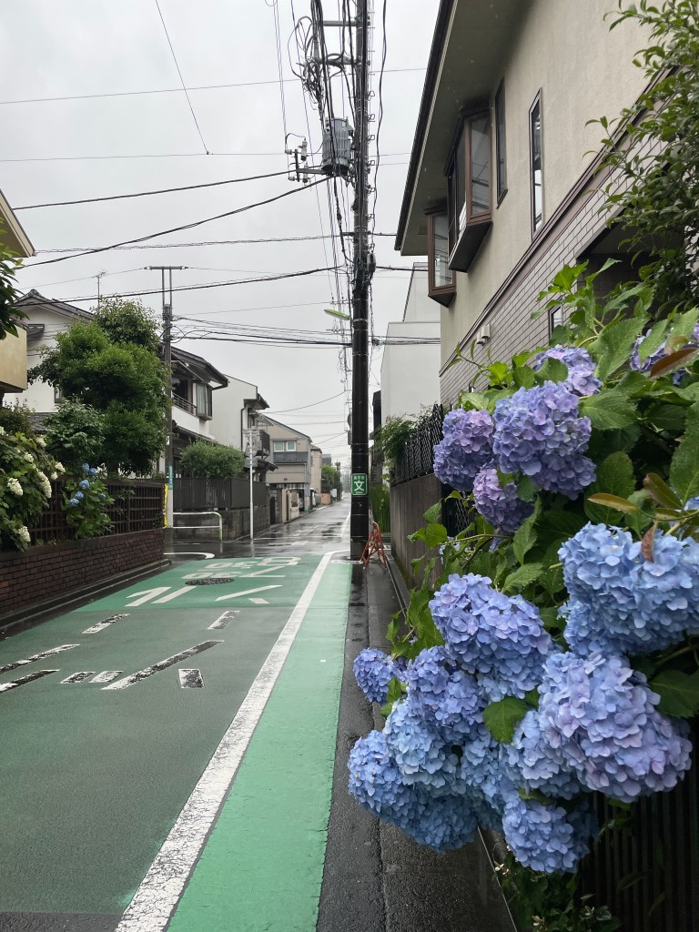 And blue hydrangeas in the rain.